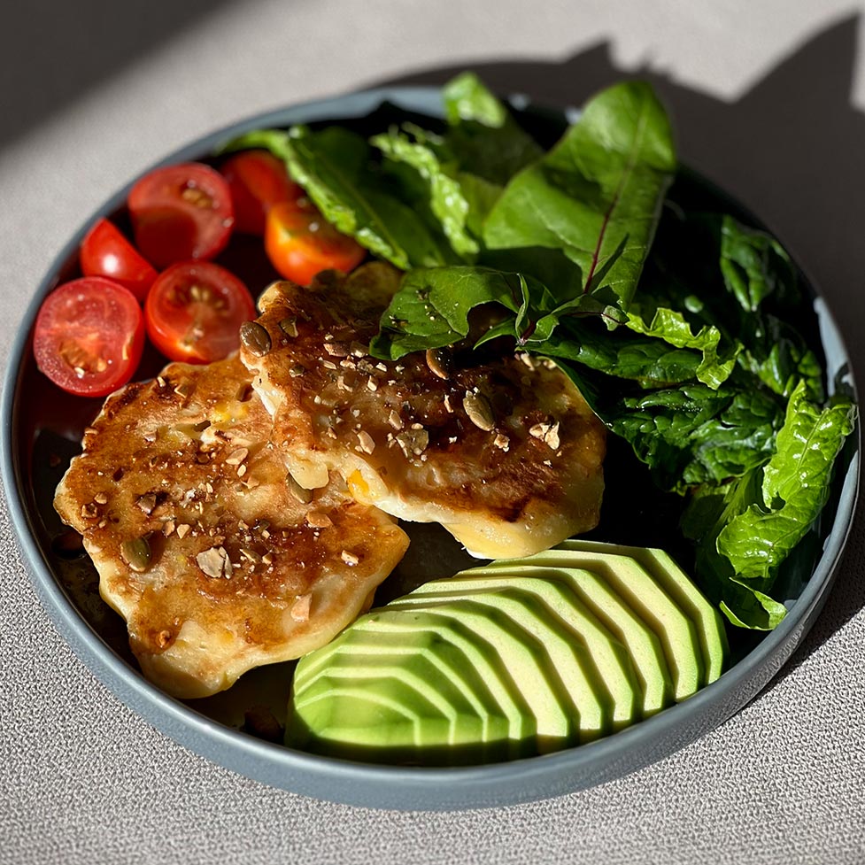 панкейки с кукурузой и сыром фета внутри, подаются с яйцом, миксом зелени и авокадо